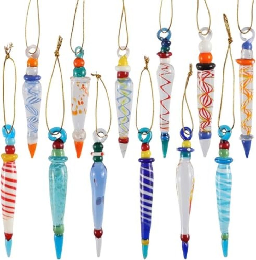 These colorful glass icicles are incredibly unique. The set of 12 whimsical glass icicles is crafted to give a sparkling effect that catches the light on the tree.