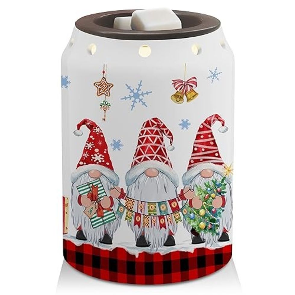 This gnome wax melt warmer is made from carved ceramic. Its distinctive red plaid adds a festive vibe. The included bulb melts wax while giving off a soft glow with its interior LED light.