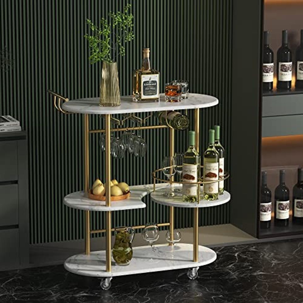 An absolute home bar classic, this bar cart is minimalist, functional, and truly beautiful. This four-tier bar cart has four shelves made of faux white marble, while the frame is made from golden iron, so it looks much pricier than it is. It also has many slots to hold your wine glasses and bottles.