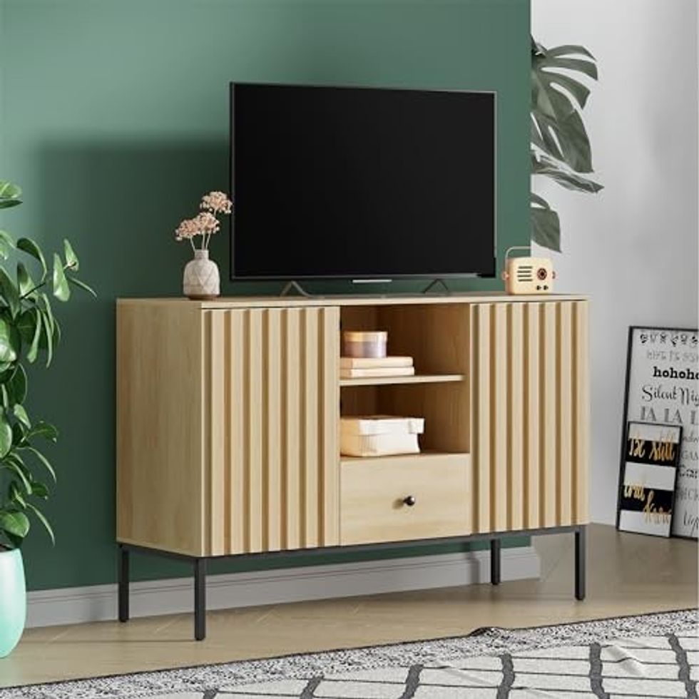 Designed with a mid-century and minimalist aesthetic, this media console has so many features to love. The two fluted doors and smooth metal legs offer that industrial aesthetic that's trendy, while the storage features a spacious tabletop and four shelves behind the fluted doors.