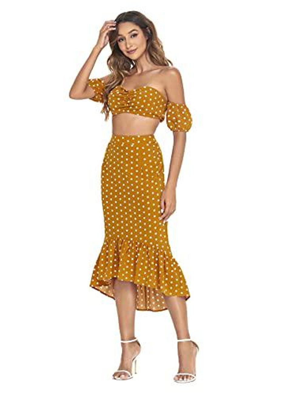 All eyes will be on you when you wear this stunning crop top and skirt set. With a lovely yellow color, polka dot print, and romantic off-the-shoulder design, it's the perfect outfit for all your Instagrammable vacation moments. The ruffle hem and smocked detailing make this set a sweet look that can easily be dressed up or down. You'll instantly feel like the model you already are!