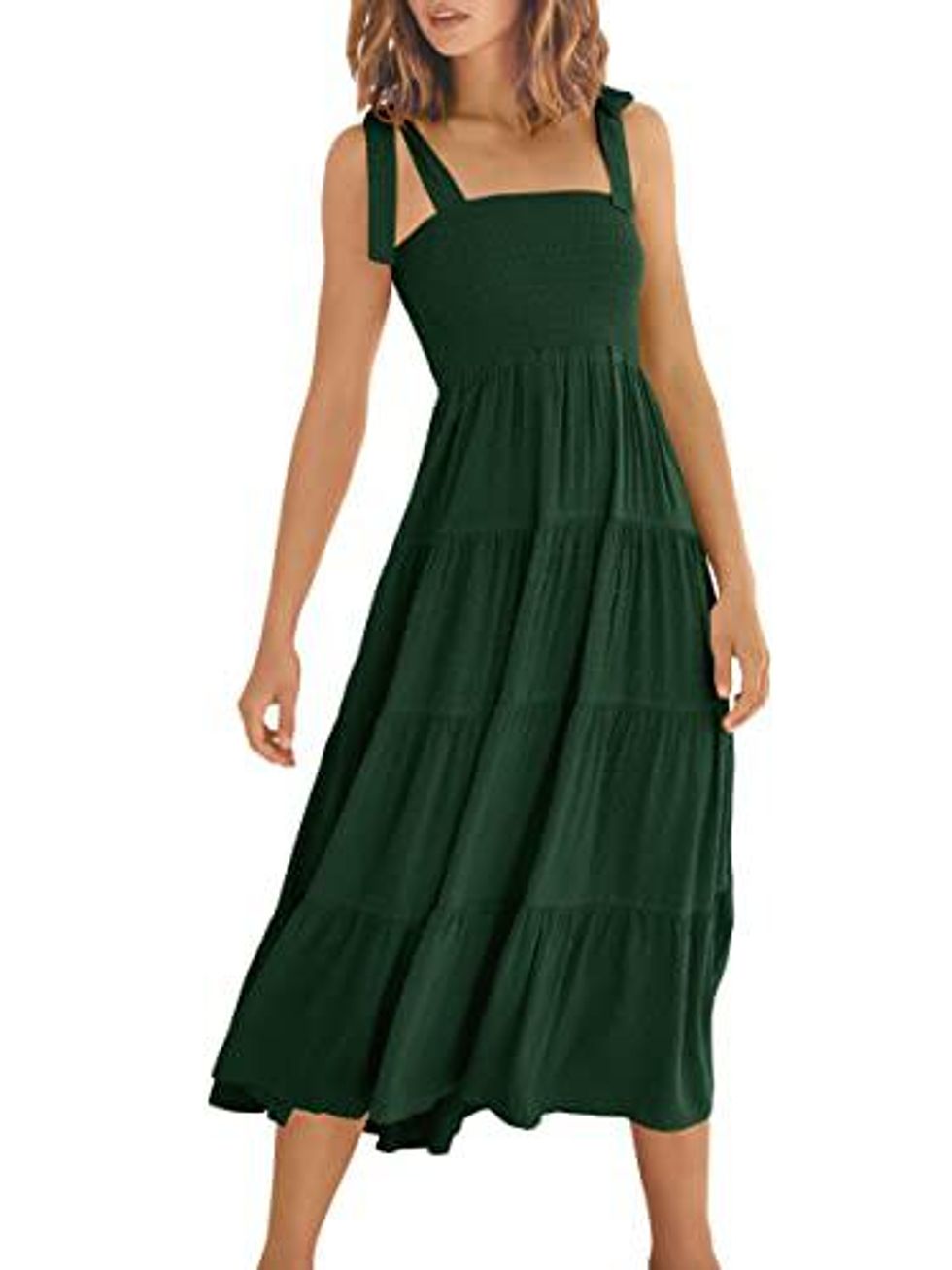 Featuring a tie-strap, smocked bodice, and flowy tiered fit, this midi dress checks all the boxes for a perfect summer dress. With several amazing colors to choose from, you'll be wearing this one as often as you can. Dress it up with heels for a night out or throw on some sandals and a denim jacket for a casual look. Plus, it's so comfortable you'll just want to live in it 24/7.