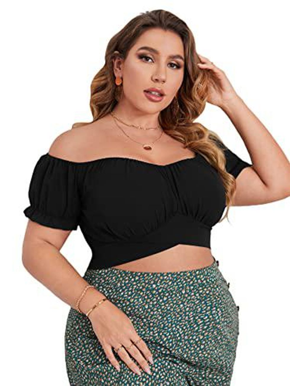Add this off the shoulder crop top to your cart for an effortlessly gorgeous look that goes with anything, from your favorite maxi skirt to your vintage jeans. With a tie-back design and puff sleeves, this top has a romantic feel that will be your new go-to for date nights, vacation or dinner with friends. It comes in several plus sizes so you can find the perfect fit for you.
