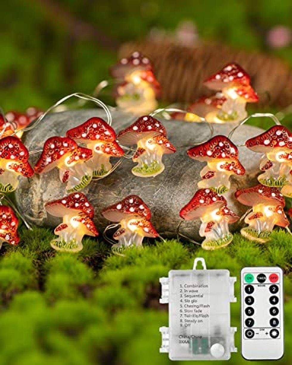 You can use these mushroom string lights both indoors and outdoors, since they’re battery-operated and waterproof. They come with a remote control for easy operation, and you can even use it to set a timer to make things easier for you.