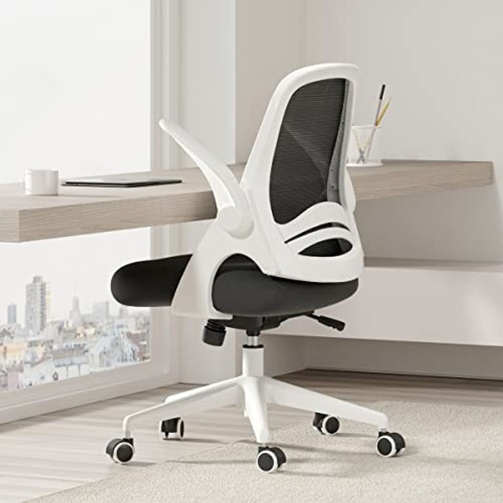 The office chair shown here features ergonomic back support, 105° tilting tension, and flip-up armrests, which make it easy to slide the chair under the desk when not in use. The seat has an increased sitting area, which is shaped to fit the curve of hips and legs and evenly distribute pressure. Offered in white, grey, and black.