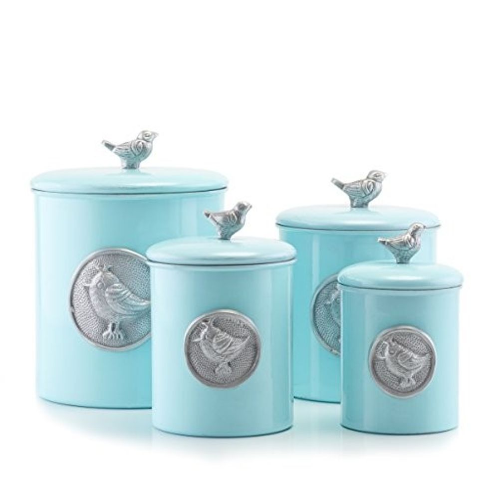 The pretty robin's egg blue of these stainless steel canisters is what initially caught our eye. The bird-shaped knobs and medallions add a charming rustic touch. A welcome bonus is the extra large capacity of the canisters -- the largest one holds up to four quarts.