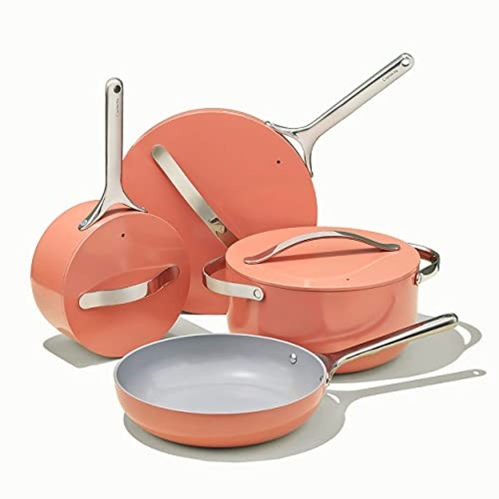 Indulge in the epitome of cookware that combines style with functionality. Seize the opportunity to snag a set at a discounted price. The Caraway Nonstick Ceramic Cookware Set includes 12 pieces, including pots, pans, lids, and kitchen storage, all meticulously designed to be non-toxic, PTFE & PFOA free.