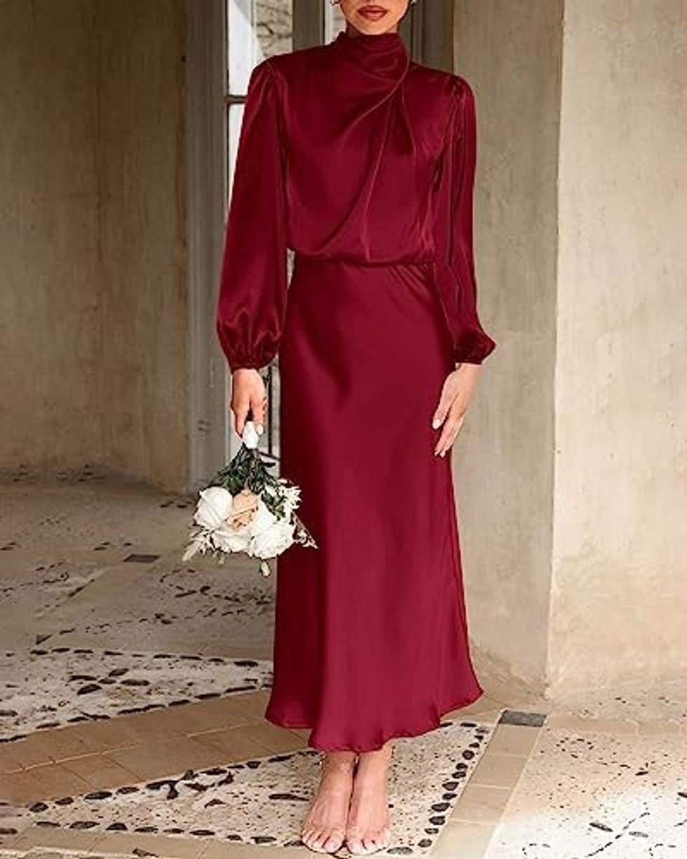 See it on AmazonFeel Classy in a Mock Neck Satin Dress