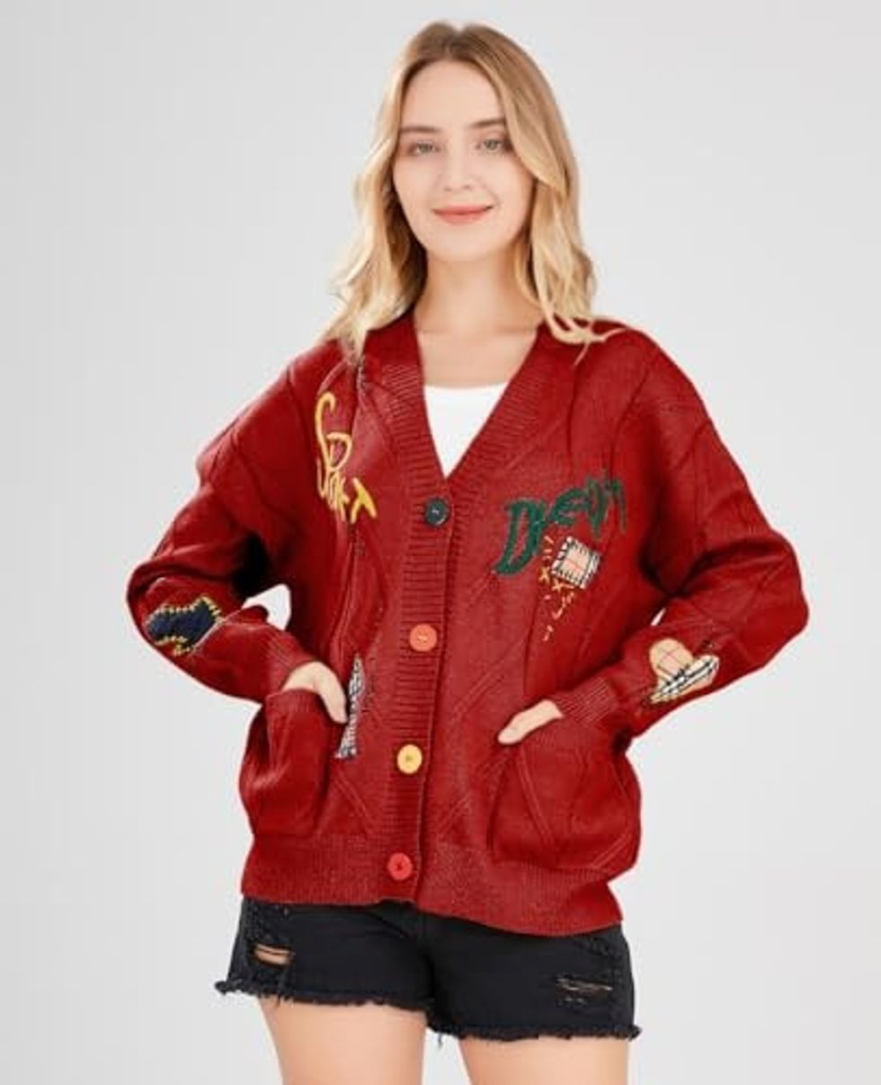 Cardigans might be trending this season, but let's not pretend that they are all built the same. If you want to stand out this winter, you're going to love this cardigan sweater. This red chunky knit sweater is adorned with unique embroidery for a vintage-inspired look.