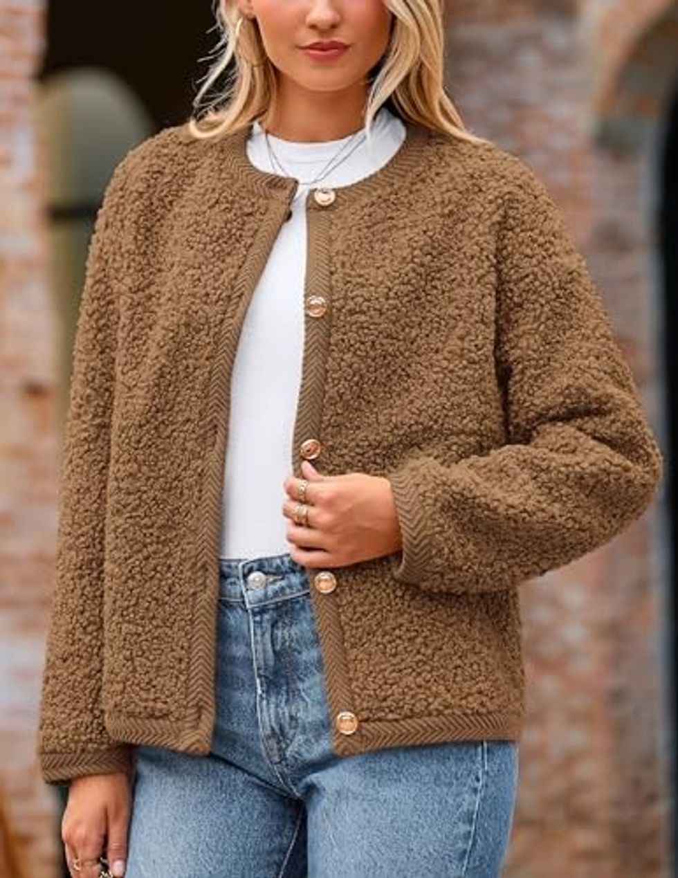If you love the sherpa trend, then this shearling coat from PRETTYGARDEN is made for you. In a toasted brown color, this is a great neutral option for the winter. With gold button-down details, this fuzzy brown jacket is cute and classy. You will definitely need this to keep you warm and cozy during the colder months.