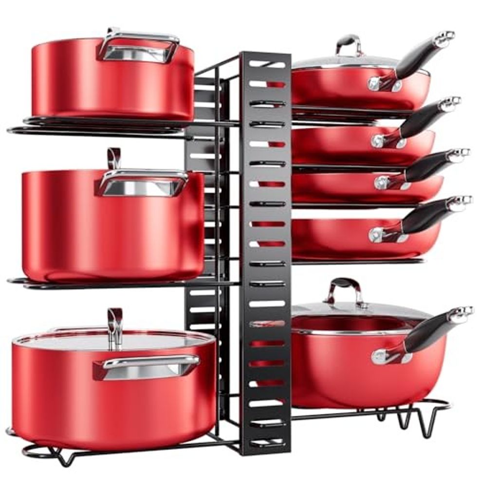 Set a goal to keep your home more organized this year with this Pots And Pans Organizer Set that is going to be a game-changer for your kitchen. This rack has 8 different tiers, providing you with plenty of space to display your kitchen essentials while making more room in your cabinets.