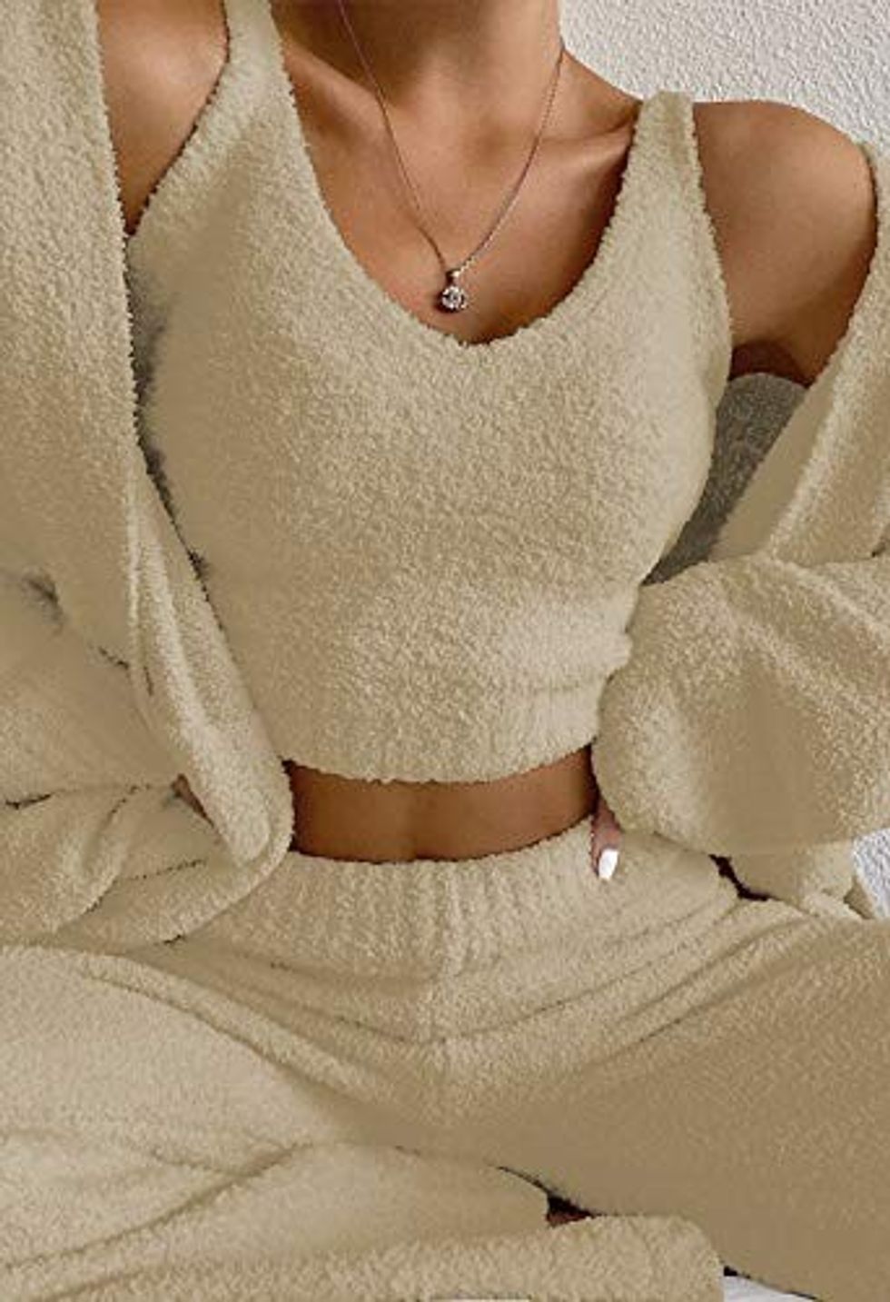 Nothing makes a girl feel more productive than working from home in a charming lounge set. It's even better when it comes with a sweater. This comfy three-piece set is the perfect dupe for the SKIMS fuzzy set and is half the cost!