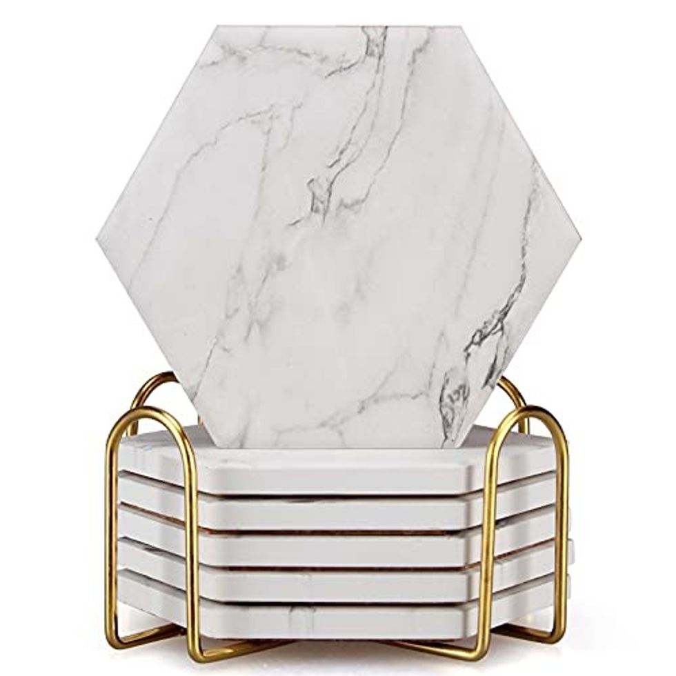 Give a little bit of luxury with these hexagon marble coasters in a fabulous gold container. They protect against cup stains and keep furniture looking pristine. Even when they aren't being used, they look like gorgeous decor pieces.