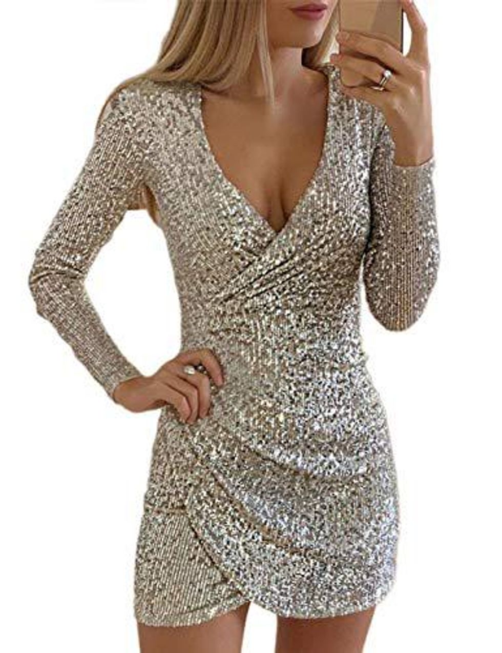 Turn heads in every direction when you walk into the New Year's Eve party in this stunning V-neck sequined dress that will hug your body in all the right places and make you feel sexy and gorgeous going into the new year. Pair this sexy dress with your favorite pair of black heels and gold jewelry for the ultimate winter celebration look! I like it in the sexy silver color!