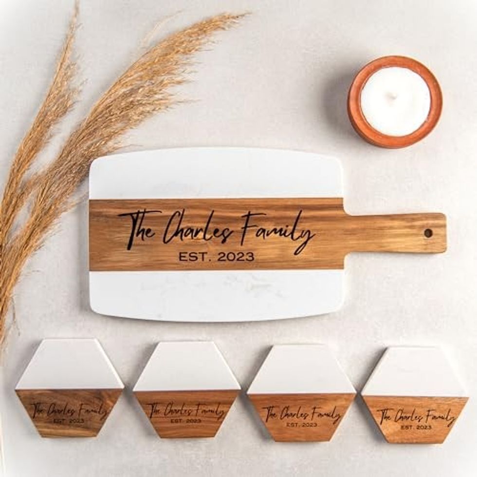 If you're searching for a practical gift for someone who enjoys spending time in the kitchen, this cutting board is a great choice. Made from a blend of wood and marble, it's both functional and visually appealing.