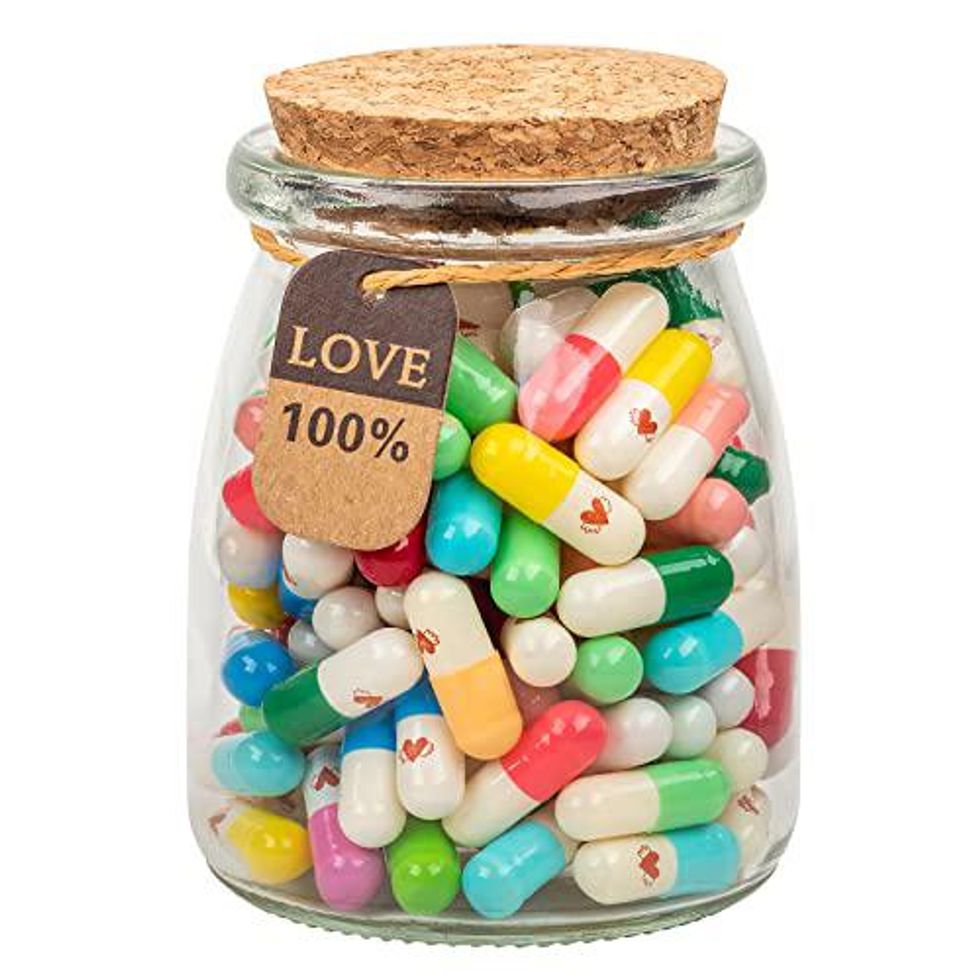 What better way to show your love and appreciation for your friends than the expression of your own feelings? With this bottle of capsules you can surprise your loved ones for months to come every time they open up a new capsule containing a message you personally wrote.