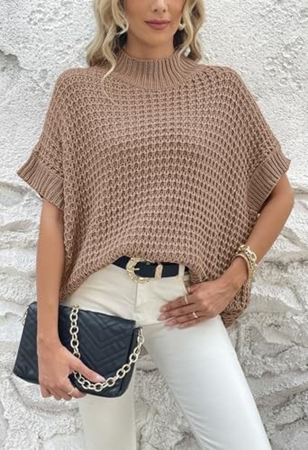 This beautiful, chunky sweater is just oversized enough. The drop shoulder on the top keeps you looking elegant and style-forward without being too hot or sweaty for warmer spring days.