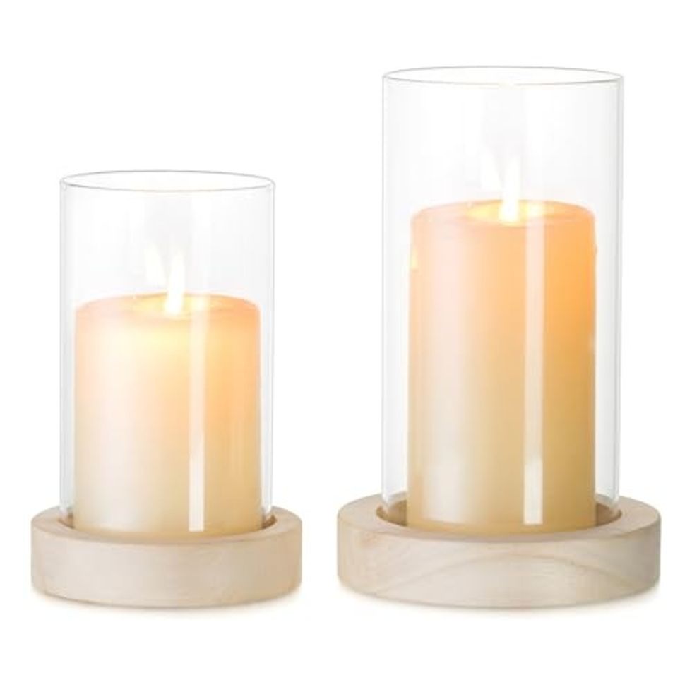 This pillar candle holder combines the elegance of clear glass with the warmth of natural wood, creating a harmonious blend of materials. Their soft candlelight enhances a calming atmosphere, while the minimalist design brings understated sophistication to any table or centerpiece.
