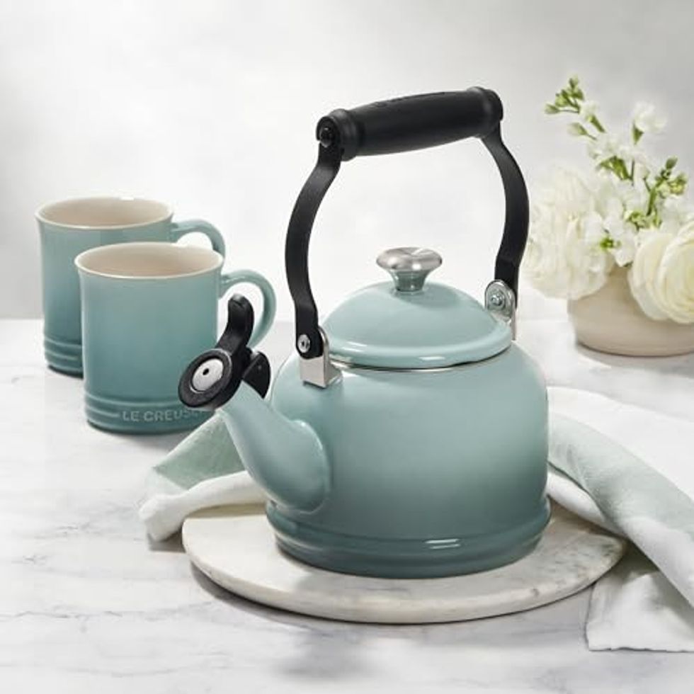 Le Creuset's enamel tea kettle combines functionality with timeless elegance, featuring a calming olive tone and gold finishes. Its soothing aesthetic and practicality create a warm, tranquil atmosphere, perfect for enhancing peaceful moments in your kitchen.