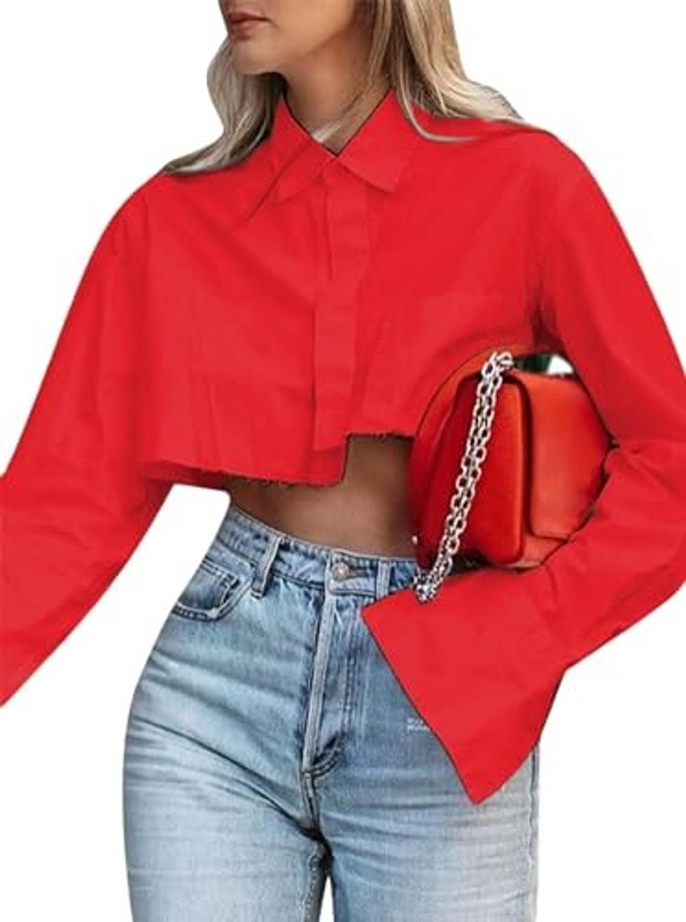 This gorgeous button-up top is oversized, but also cropped, creating a really interesting and exciting look that feels high-fashion. Choose from a handful of pink shades or a bold red.