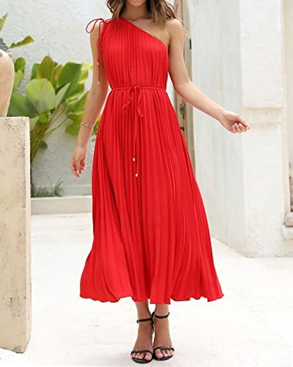 Feel like a goddess in this one-shoulder maxi dress that is certain to turn heads. The pleated fabric allows you a bit of breathing room as it's more of a relaxed fit and has a drawstring waist to cinch you in in all the right places.