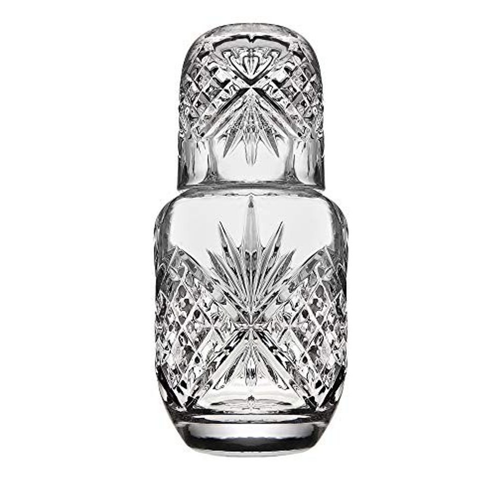 The elegant carafe, made of cut crystal, has gained social media attention. This serving set includes a 16-ounce pitcher and matching glass, praised for its durability and sophistication. Dishwasher-safe, it adds a touch of elegance to any nightstand or dining setting.