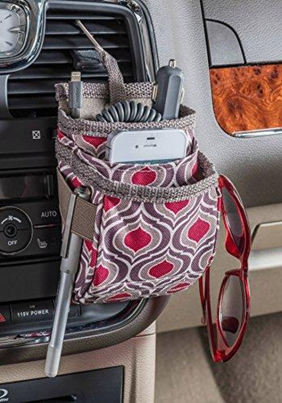 We've found the best way to store phones and other accessories while driving. This Front Seat Storage Organizer features soft-lined pockets for protected sunglasses and phone storage. A space-saving air vent phone mount stores cell phones, cords, and sunglasses within easy driver reach.