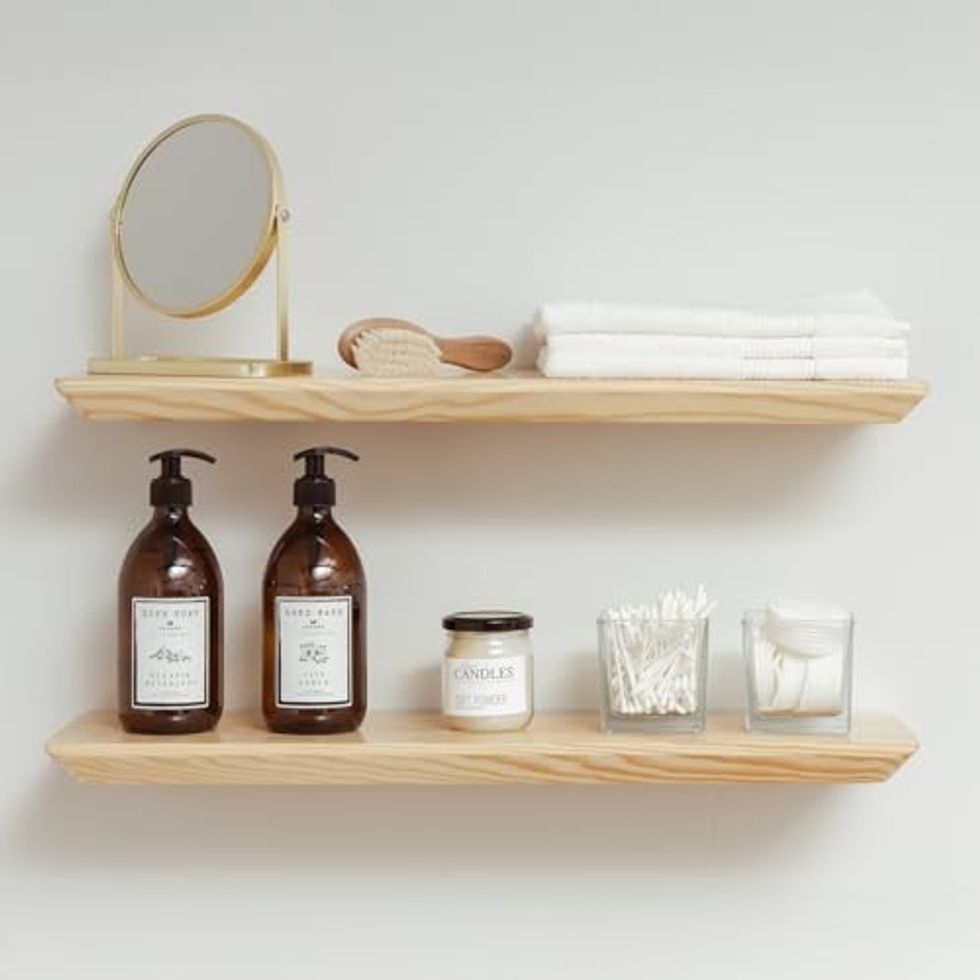 Floating natural wood shelves are both functional and decorative. Use them to display books, plants, or small decor items, adding an organized and polished look to living rooms, offices, or kitchens.