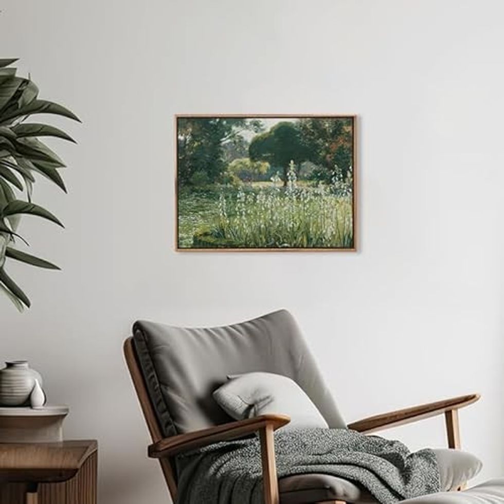 This canvas captures a vintage landscape with a meadow of flowers. Sized at 24”x36”, it fits beautifully in a modern farmhouse, cottagecore, or vintage decor style. Ideal for bedrooms, bathrooms, or offices, this piece provides a tranquil and artistic touch.