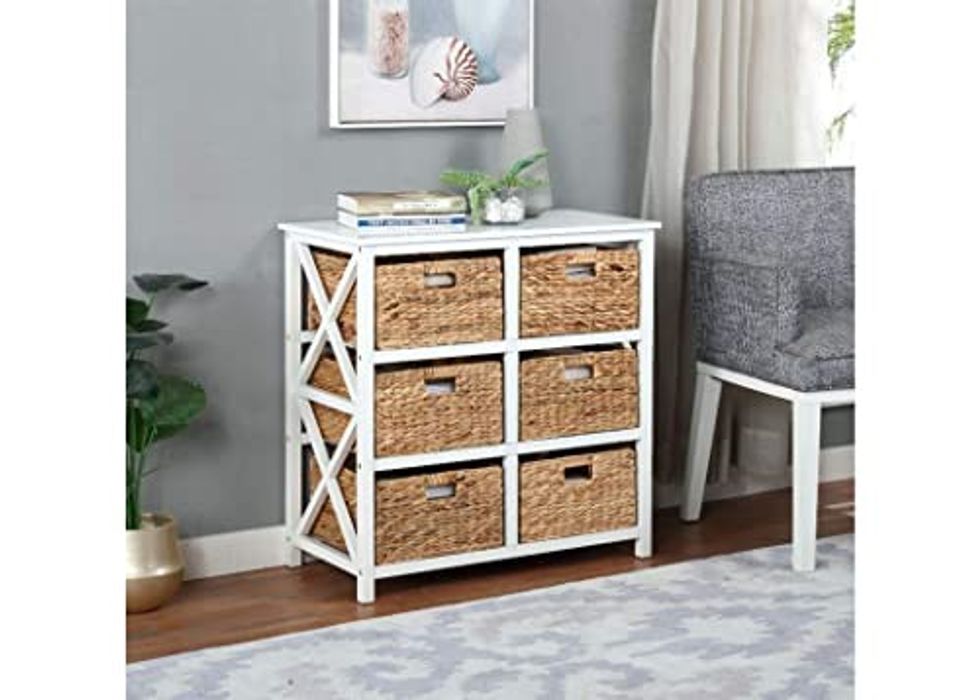 A solid wood three-tier storage cabinet is a must-have in a small living space. Each shelf fits its own collapsable wicker basket to conceal any clutter you might be hiding in plain sight.