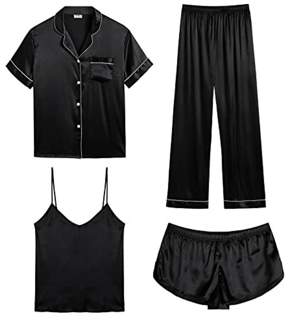 No matter what the weather is or if you tend to switch between feeling hot and cold at night, this silky pajama set is for you. It comes with both matching shorts, pants, cami top, a button-down short sleeve shirt. Best of all, the luxurious satin fabric adds a touch of elegance to your sleepwear.