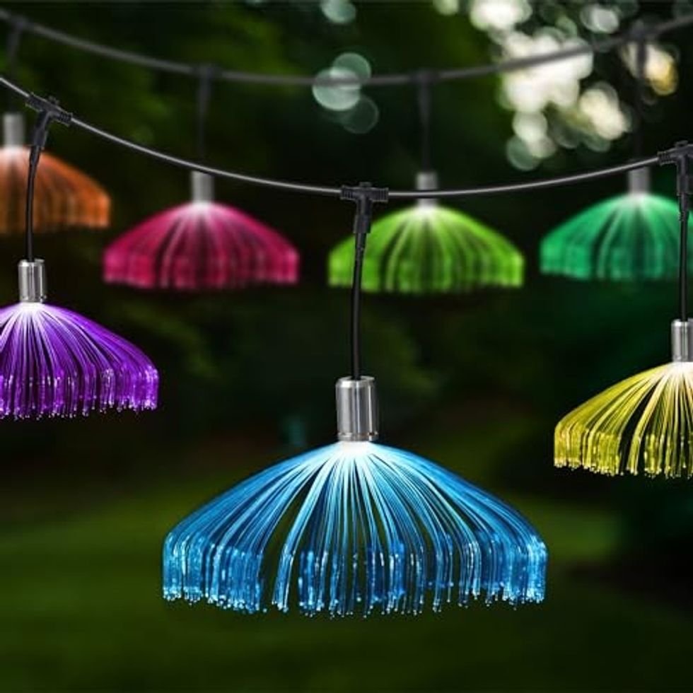 The fiber-optic jellyfish string lights shimmer like underwater spirits, suspended from trees in neon gradients that shift with the breeze. Waterproof and enchanting, they bring a Studio Ghibli glow to backyard evenings like jellyfish floating through twilight air.