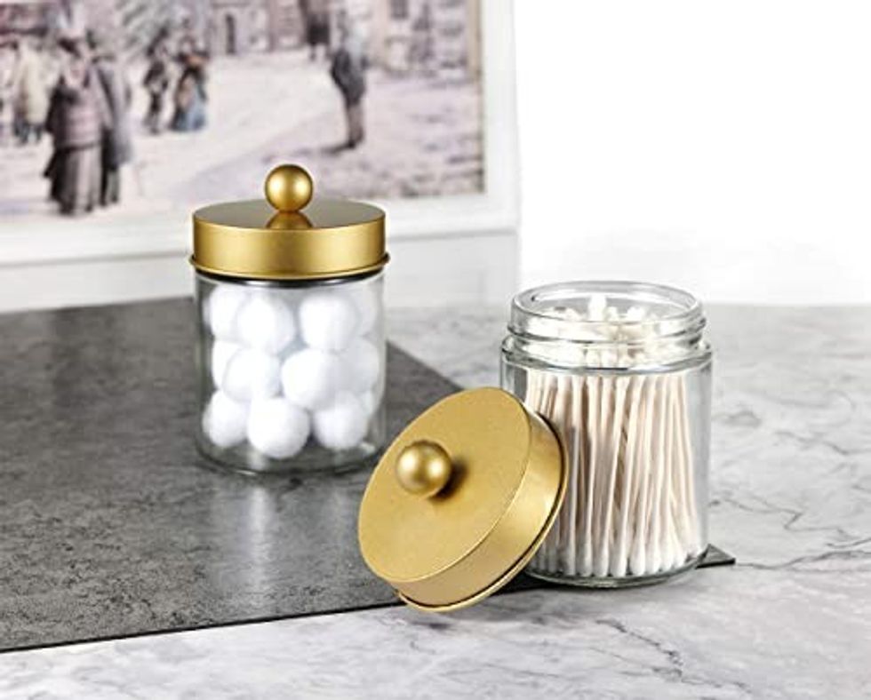 These Apothecary Jars are cute and functional glass canisters with a lid, perfect for storing items like cotton swabs, bath salts, and hair bands in your bathroom.