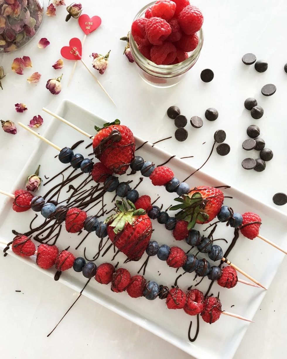 1. Add fruit to each skewer. Place filled skewers on a plate.