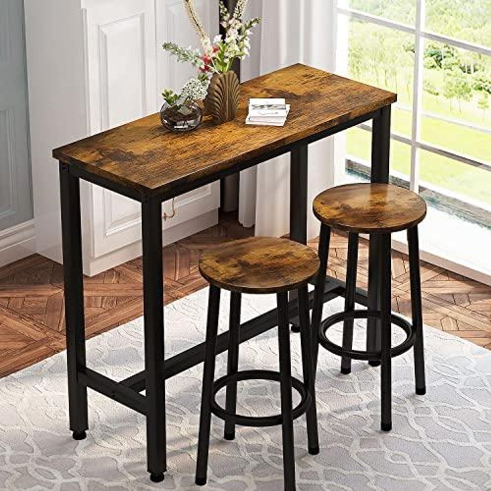 Place this bar table and stool set in your kitchen area for a fun breakfast nook. If you live in an apartment, the table and stools can be used as a cozy, dining table for two. One reviewer noted it was “ideal for my small kitchen area”. Put it in a bar area of your house and enjoy conversations over cocktails. The rustic brown wood look of the table and stools has a classic appeal.