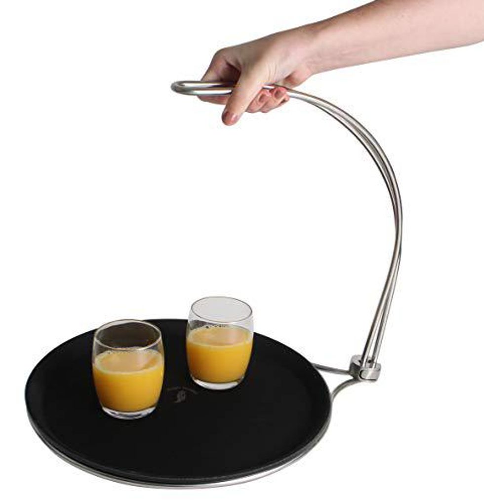 This serving tray is very easy to use, and it lets you hold it with one hand, leaving your other hand free to open doors, hold banisters, etc. It is such a great, innovative design that is useful for older people, disabled people, or those working in hospitality. The tray is safe and stable, and it has a removable handle ad collapsible design for easy storage and wash.