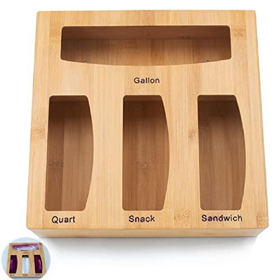 Make finding the right size bag easier with a Bag Storage Organizer. Laser engraved letters label the compartments for Snack, Sandwich, Quart, or Gallon bags. Compatible for use with most brands of storage bags. Made of 100% natural Bamboo.