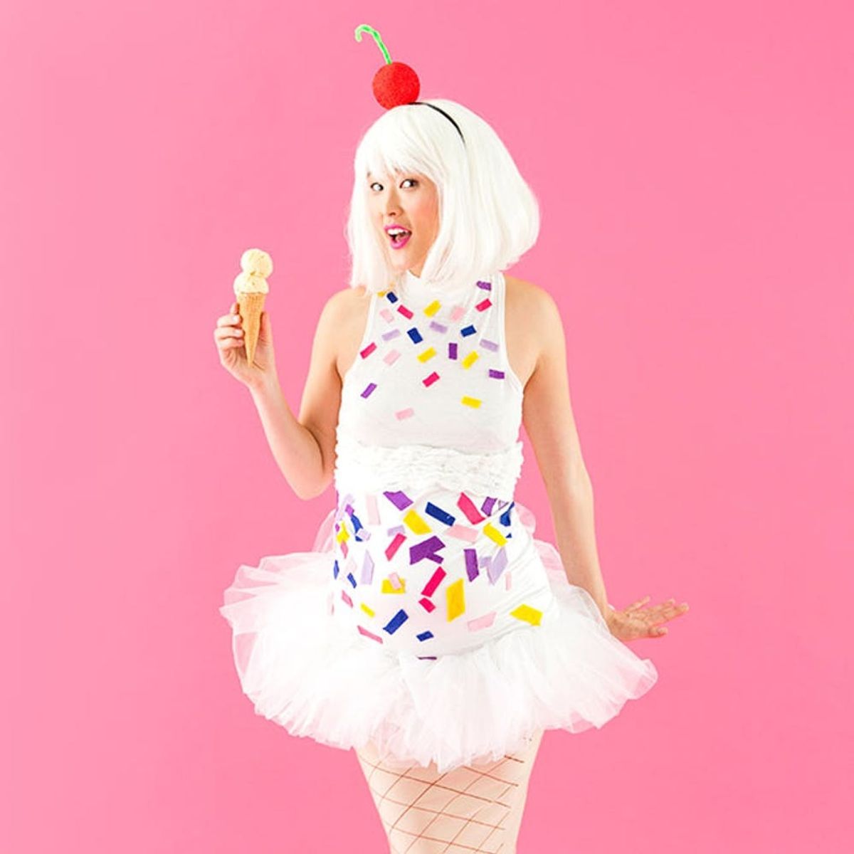 This cone won’t melt, but your heart sure will when you see this costume! It is TOO CUTE. To create this three-tiered vanilla cone, get a white wig, a white crop top and stretchy white jersey to sew into a band for your belly. Cover the belly band and crop top in felt sprinkles and add dark brown lines to a tan skirt for the cone. Finish off the look with a cherry headband (made from a painted foam ball and green pipe cleaner), pink lips and white heals.