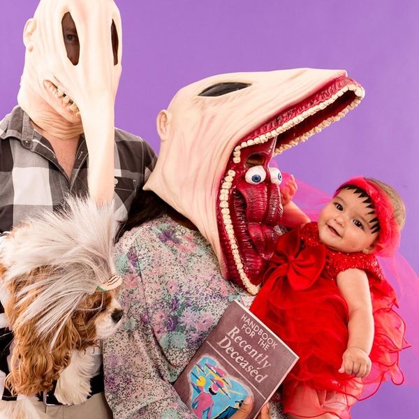 The first step is to open up your laptop. Head to Amazon and add all of these goodies to your cart: Beetlejuice Pet Costume; the Dad (Adam) Mask; the Mom (Martha) Mask; Handbook for the Recently Deceased; and this Red Baby Girls’ Pageant Dress. For the parents’ outfits, we found these pieces at Goodwill, but you can probably dig up something similar in your closet.