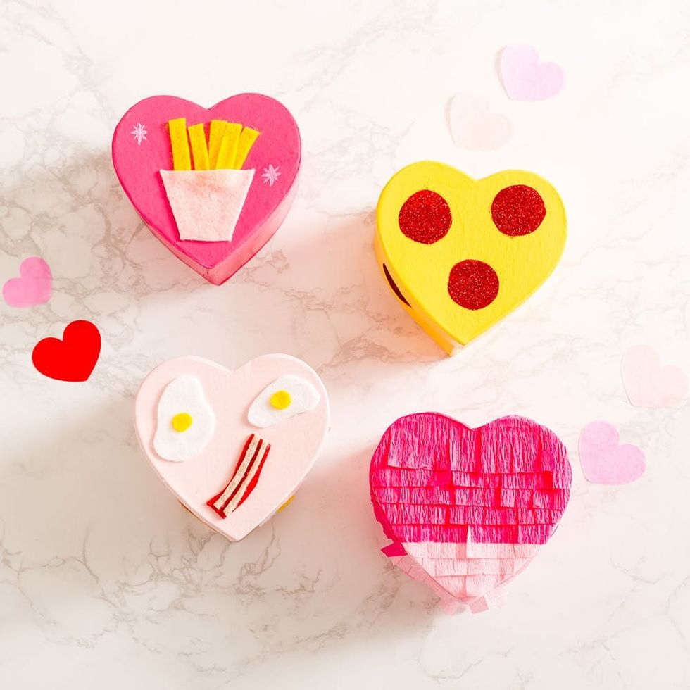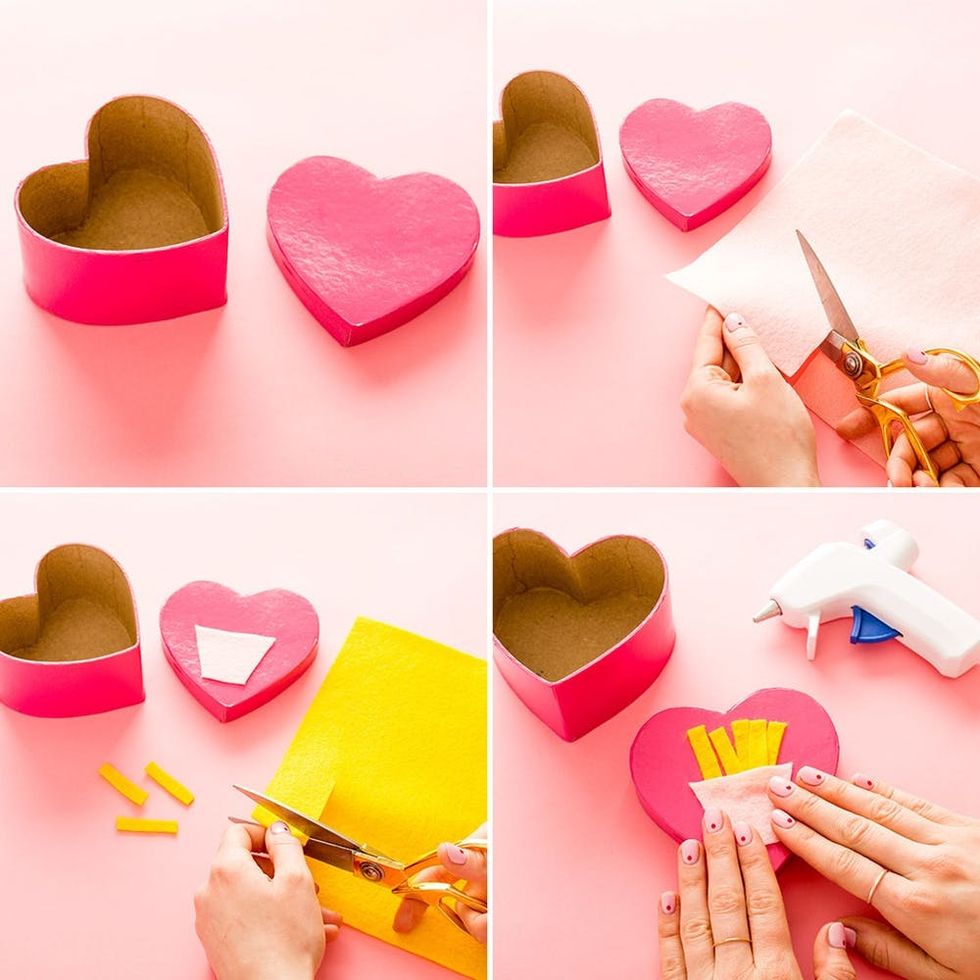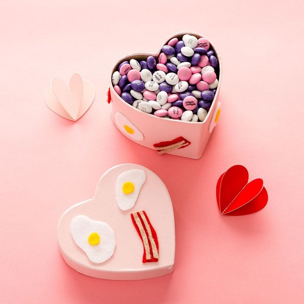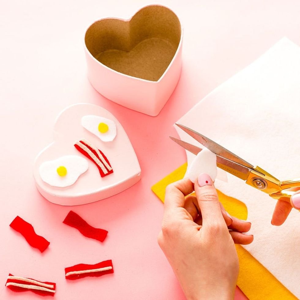 First, spray paint a heart box light pink. When the paint is dry, cut out bacon and eggs from felt and hot glue the eggs and bacon onto the box. Don’t worry about making them look perfect; we didn’t draw them out beforehand, just freestyled it.