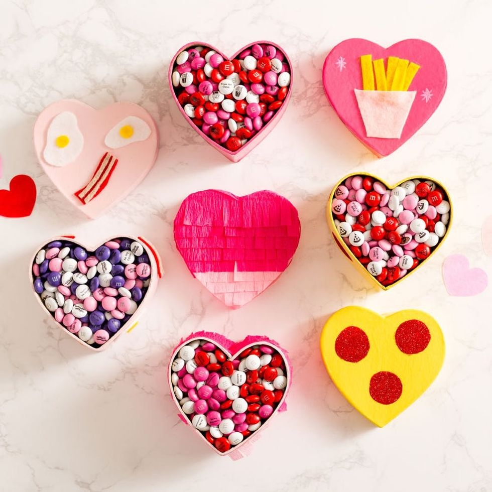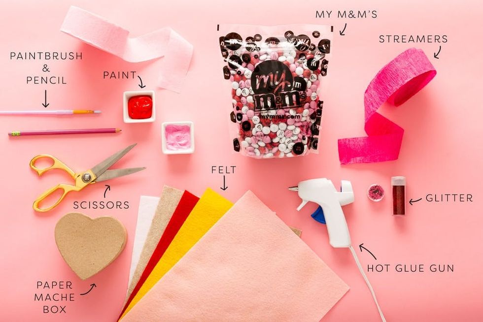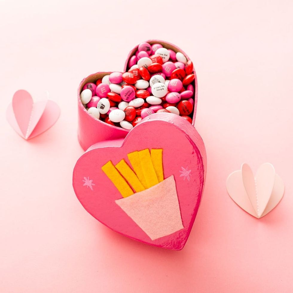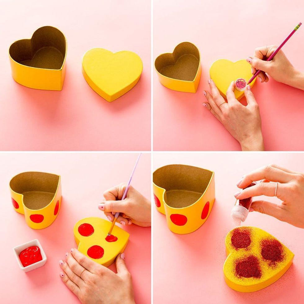 Begin by spray painting a heart box a cheesy yellow color. Make sure you don’t get any paint on the inside of the box where your chocolates will go. After the yellow paint dries, use a small circular object to trace circles — this is your pepperoni. Paint the pepperoni red and sprinkle with red glitter while the paint is still wet. Shake off the excess glitter. Once the box is fully dry, fill it up with custom M&M’S.