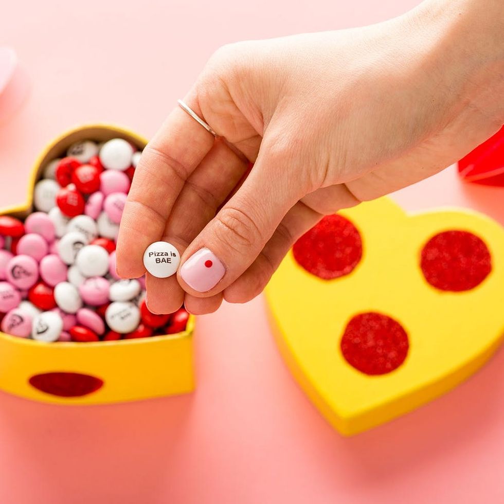 We all have that friend who’s constantly thinking of food, perhaps even while enjoying their current meal. When looking for the right treat for them this Valentine’s Day, look no further. This DIY celebrates a food group staple, pizza, and is filled with “Pizza is BAE” M&M’S. Does it get any better?