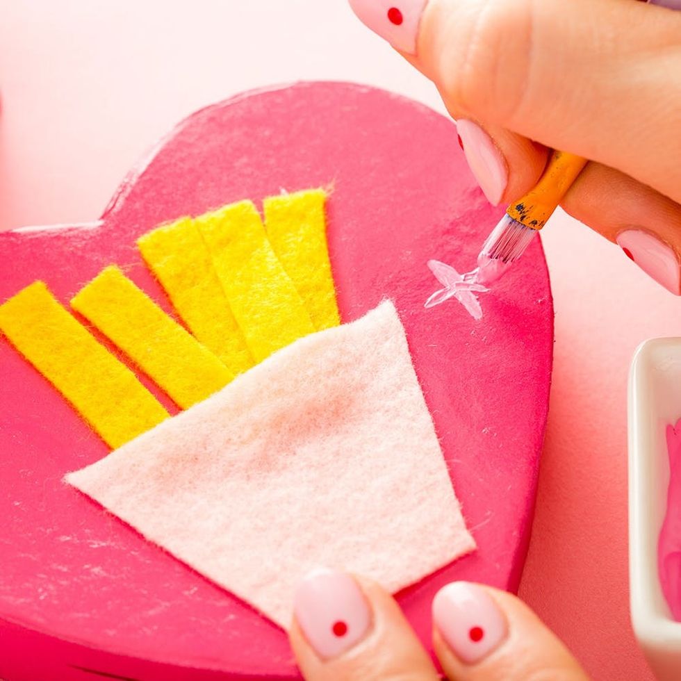 Start by spray painting a box dark pink. While the paint dries, cut French fries and a small fry box out from yellow and light pink felt. Once the paint is dry, hot glue the box and fries onto the heart box.