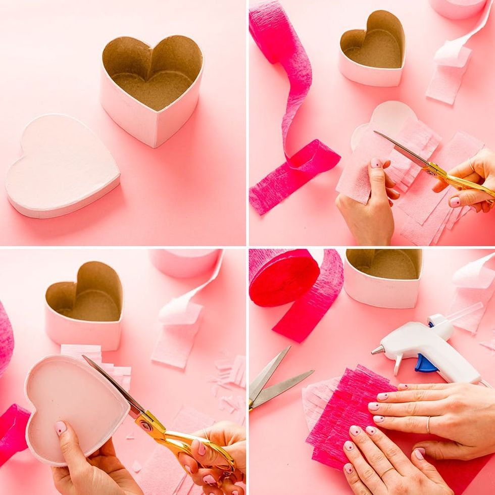 Spray paint a heart box light pink and set aside to dry. Cut strips of streamers and fringe. Next, hot glue the strips of fringe all over the box and trim as you go.