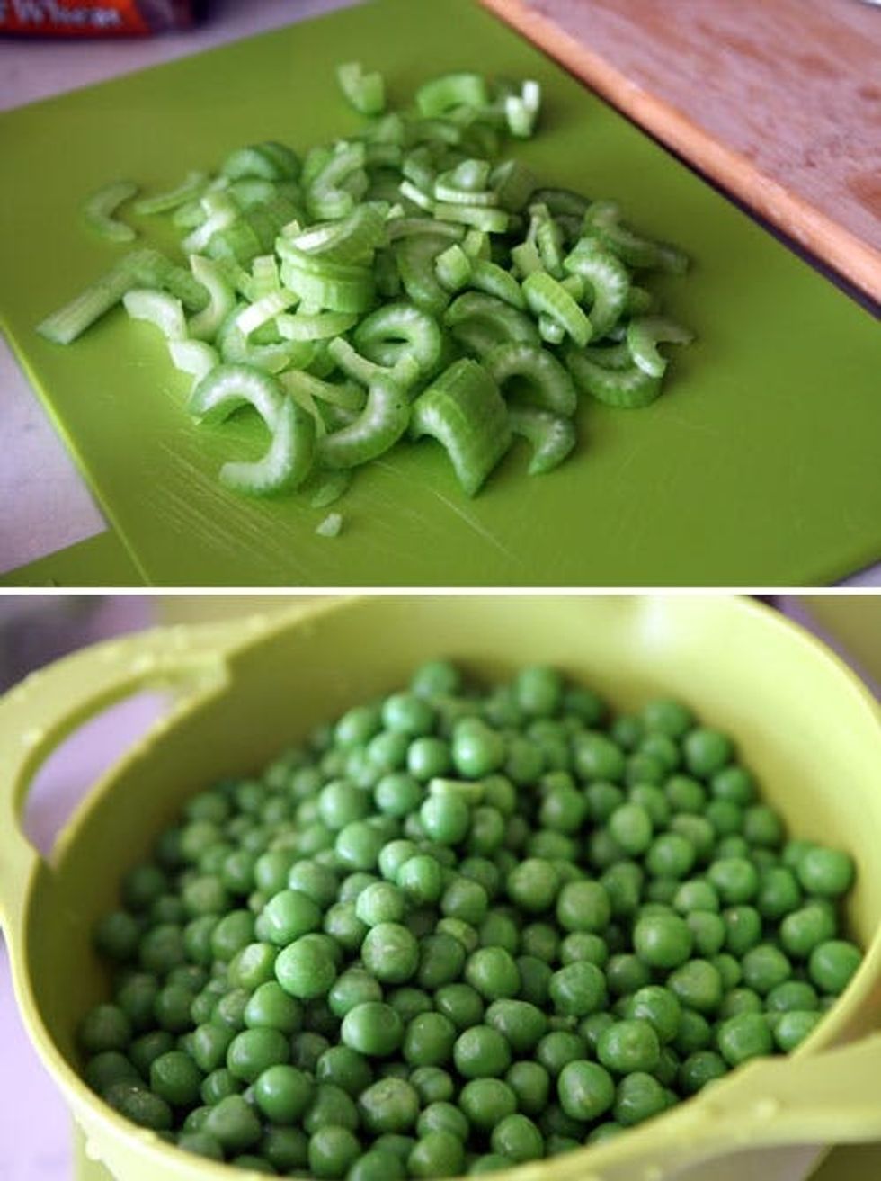 While the eggs are cookin’, chop up celery, arugula and avocado to to make the egg salad green. Cook up your frozen peas for the frosting.