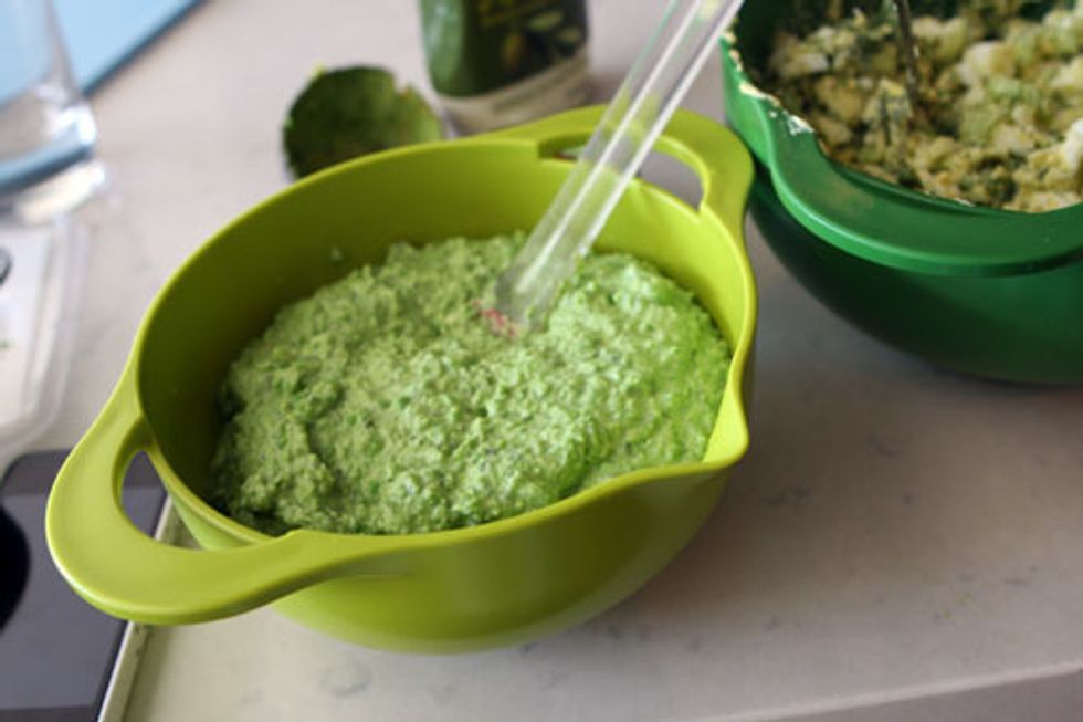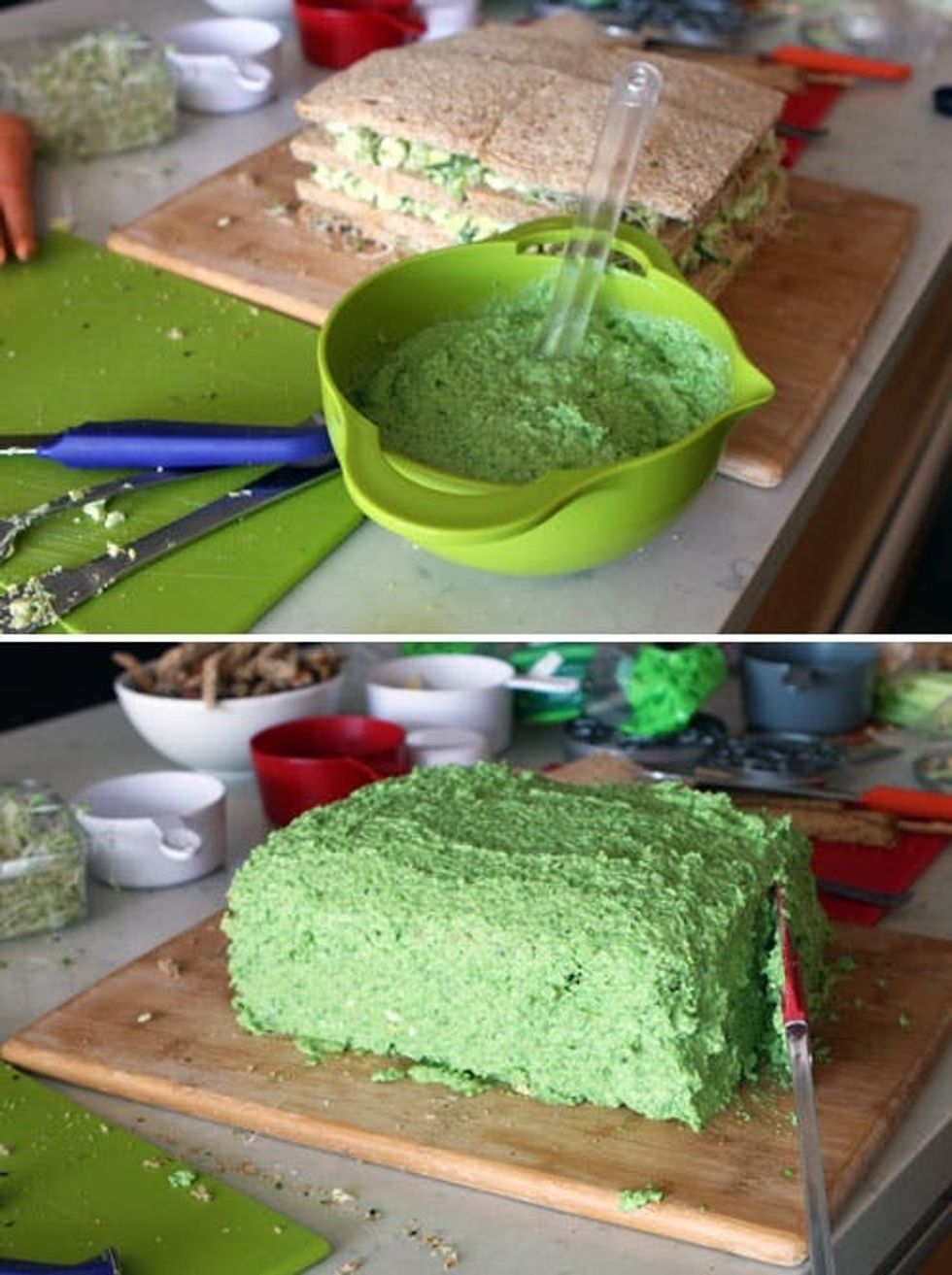 Now it’s time to whip up your frosting. Cook a bag of frozen peas (stovetop or microwave – each take about 3 minutes). Place peas in your food processor with the cream cheese and basil. Add salt and pepper as desired and puree.