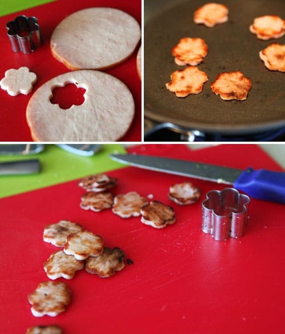 For toppings, we used our favorite kitchen tool (mini cookie cutters) and cut out little Canadian bacon flowers. Fry up the bacon flowers and set aside.