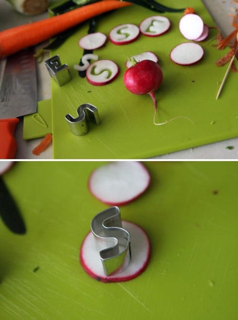 For Dr. Seuss’ name, we sliced radishes and used Alphabet Mini Cookie Cutters to cut each letter out.