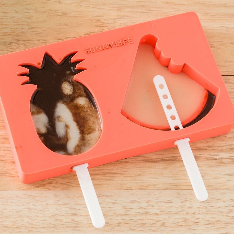 Transfer the mixture into plastic bags and pipe into the popsicle mold — think about which colors you’d like to have in each area. Place in the freezer for one hour before adding the next layer.