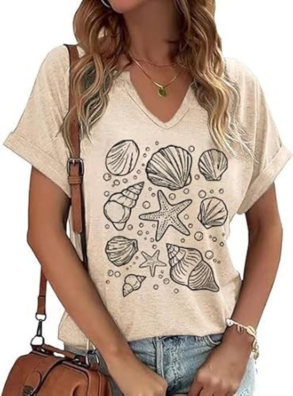 The Ovazly seashell print V-neck tee feels like the ocean’s version of a favorite white T-shirt. Lightweight and scattered with seashell illustrations, it’s made for coastal road trips, salt-tinged breezes, and dressing like the shore even when you’re far from it.